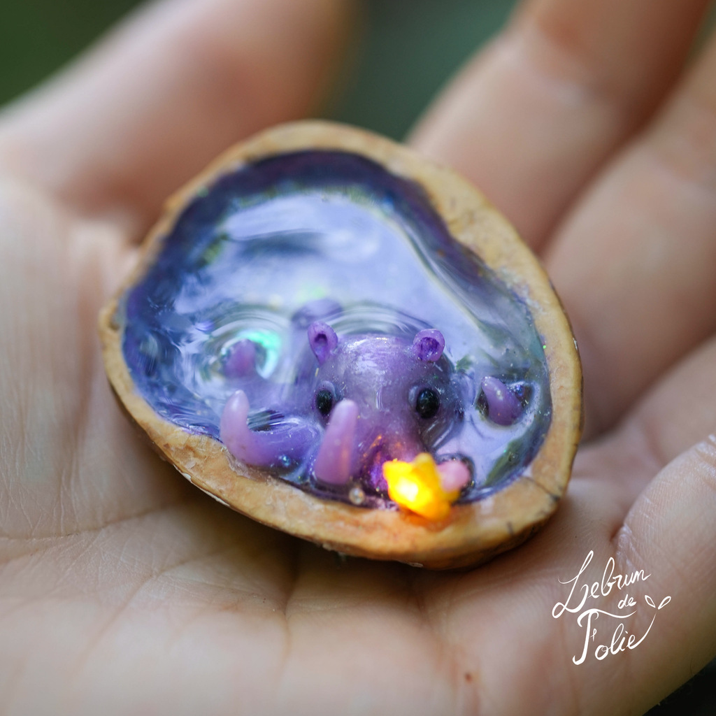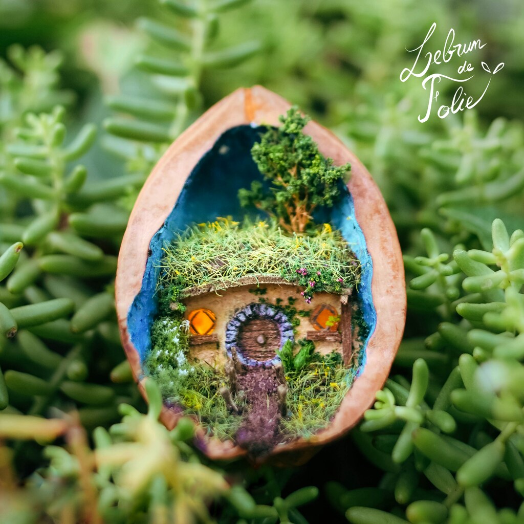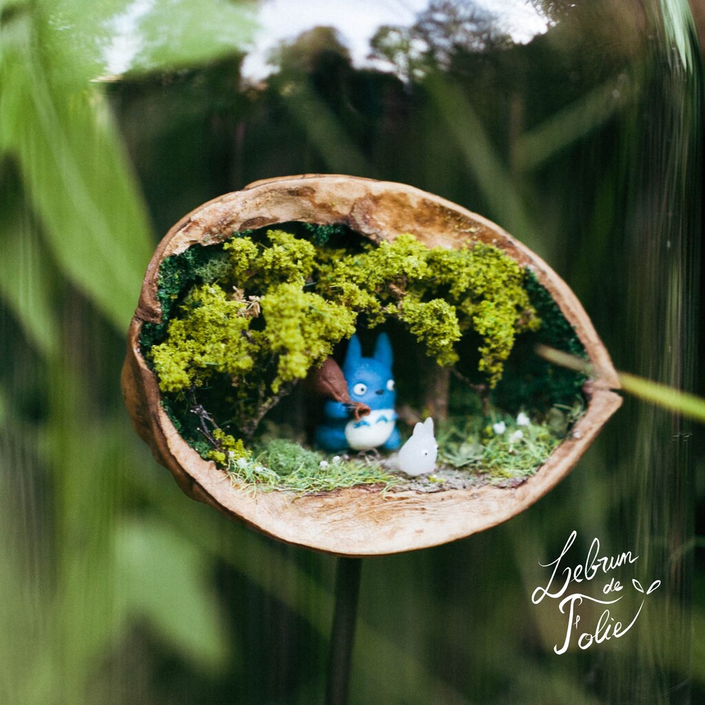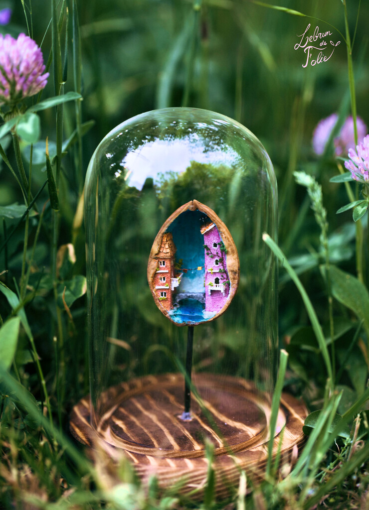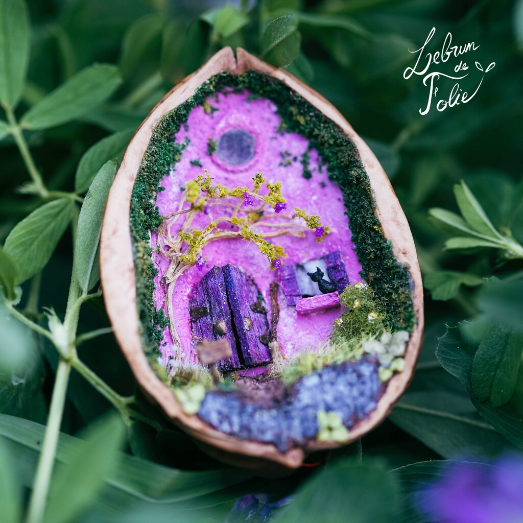 Petite, je m’arrêtais sur le trajet de l’école pour observer les insectes, en parallèle je dessinais des villages champignons habités par des insectes. En grandissant ses passions se sont matérialisées en créations. Aujourd’hui, je crée différents univers miniature dans des noix, sous des cloches et dans des cadres !