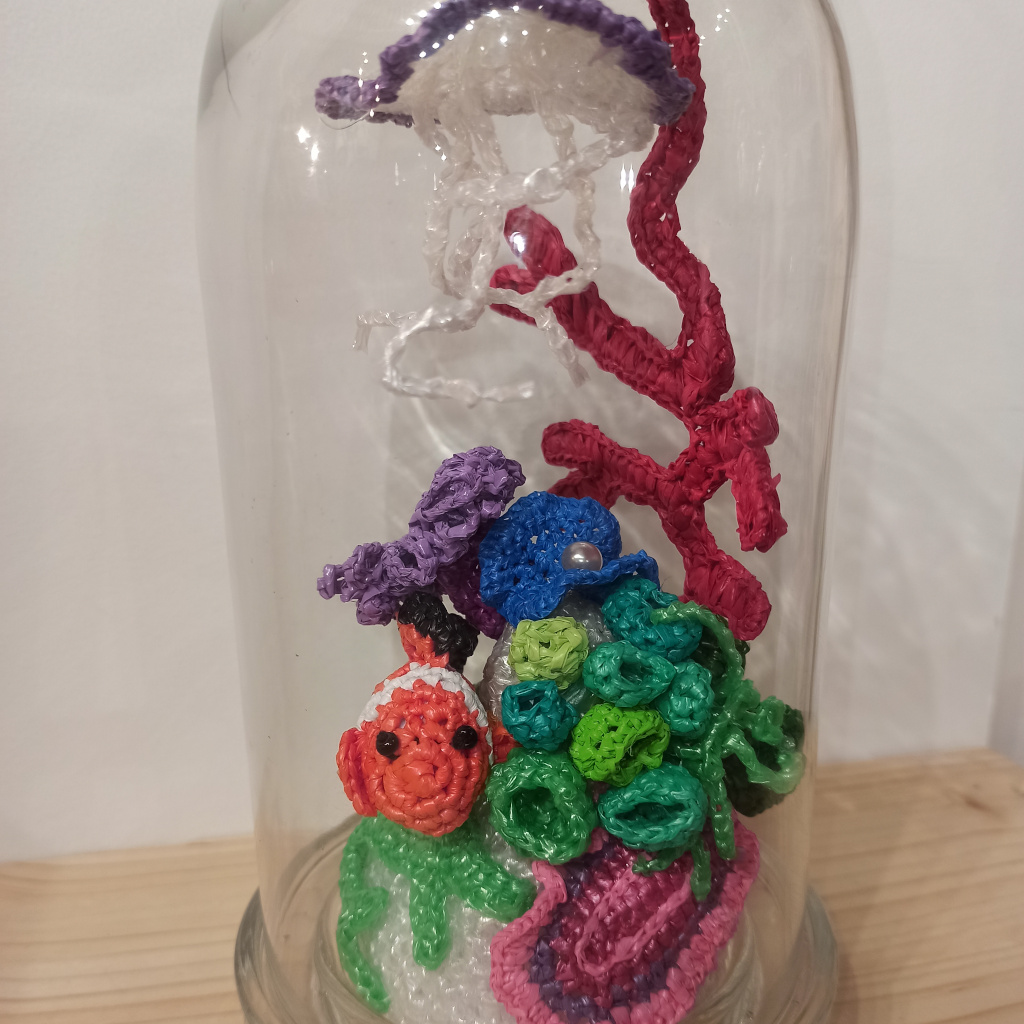 Il y a parfois des petits secrets cachés, des morceaux d’enfance pris dans les filets du crochet … des perles à repasser, des perles trouvées, des curiosités de plastique ou de tissus.
