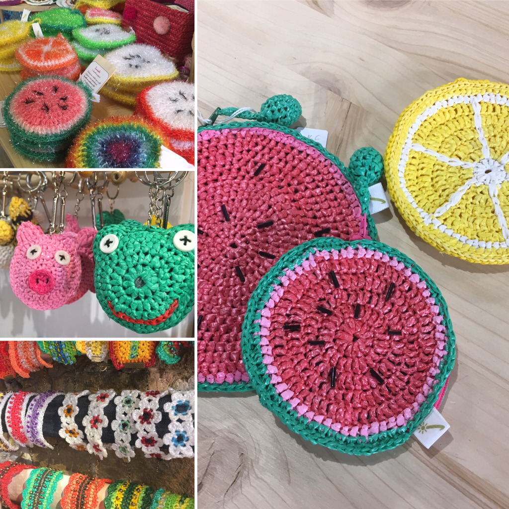 Rêves, qu’elle attrape dans ses filets colorés, qu’elle tisse et crochète au gré des trouvailles urbaines. Car oui, même si l’on n’en croit pas ses mirettes, c’est bien à partir de sacs plastiques que sont crochetés trousses à trésors, colliers et barrettes à fleurs, besaces à coquillages et à secrets.