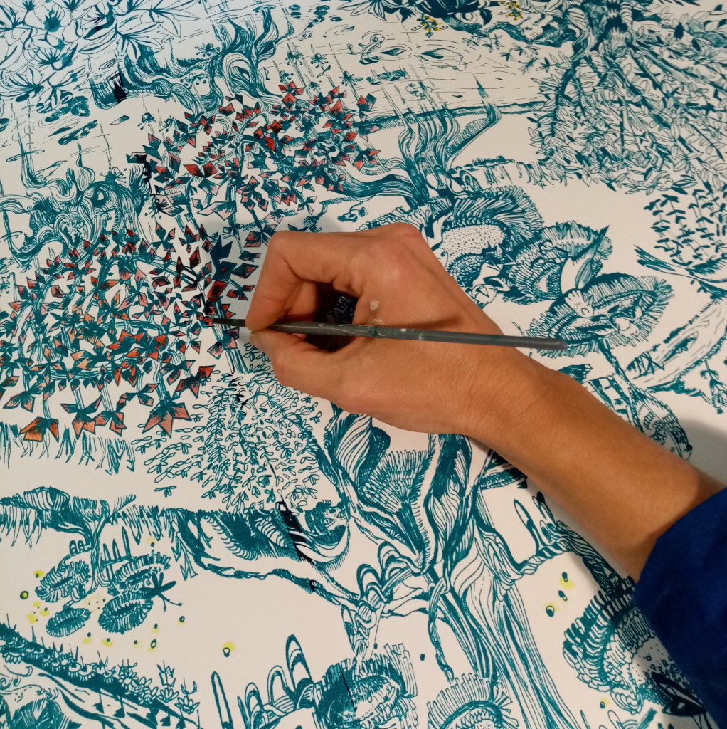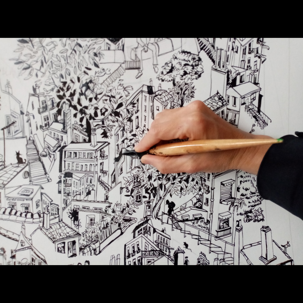 Elle est toujours prête à relever des défis et créée avec plaisir des commandes personnalisées, allant d’illustrations, papier peints imprimés avec ses propres motifs à dernièrement la réalisation d’une fresque murale entièrement réalisée à la main dans la caserne des pompiers de la croix-rousse.