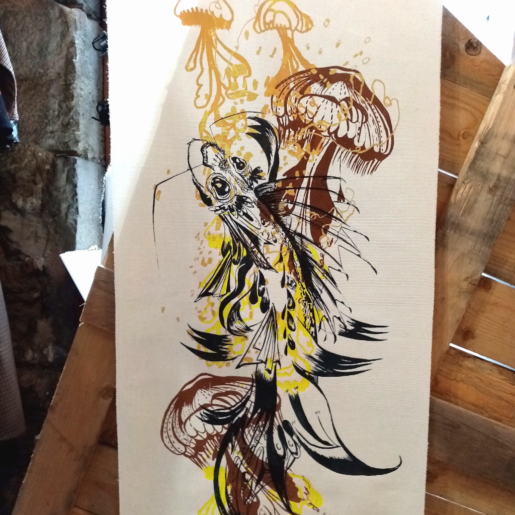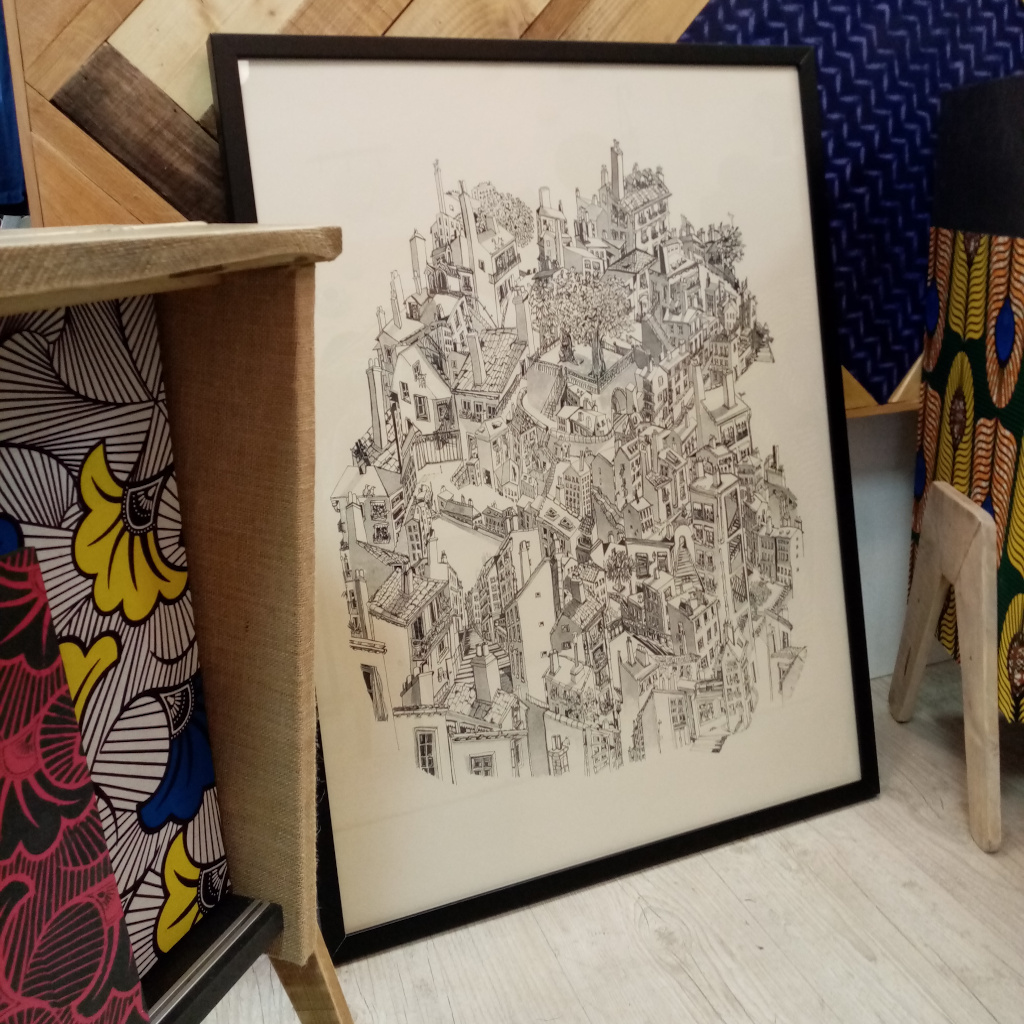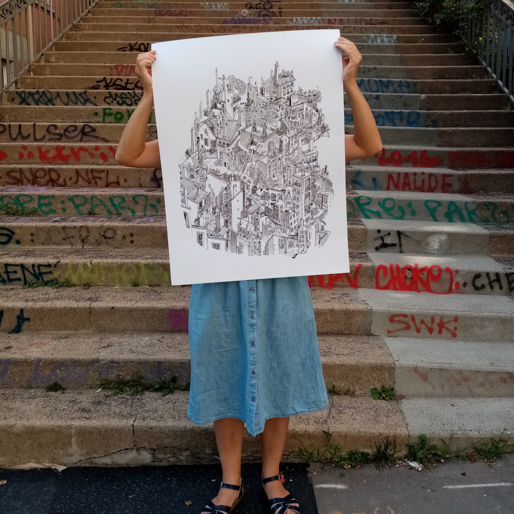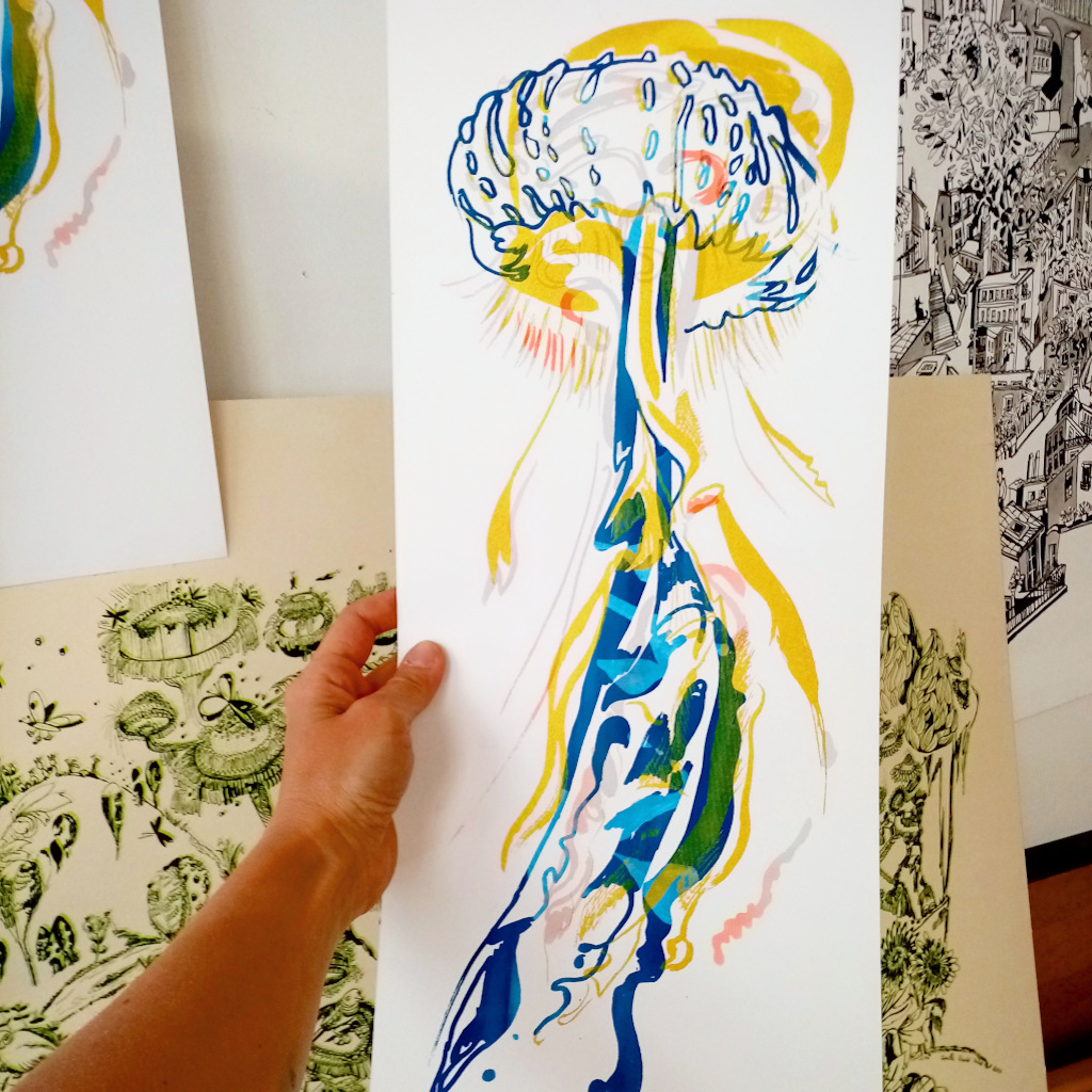 Camille, illustratrice de talent a découvert la sérigraphie en 2013. Grâce à cette technique, elle nous propose toute une série de cartes, posters sur le thème de la ville mais aussi des mondes imaginaires remplis de créatures et végétation luxuriante, oiseaux, arbres et poissons tout droit sortis des abyssses.