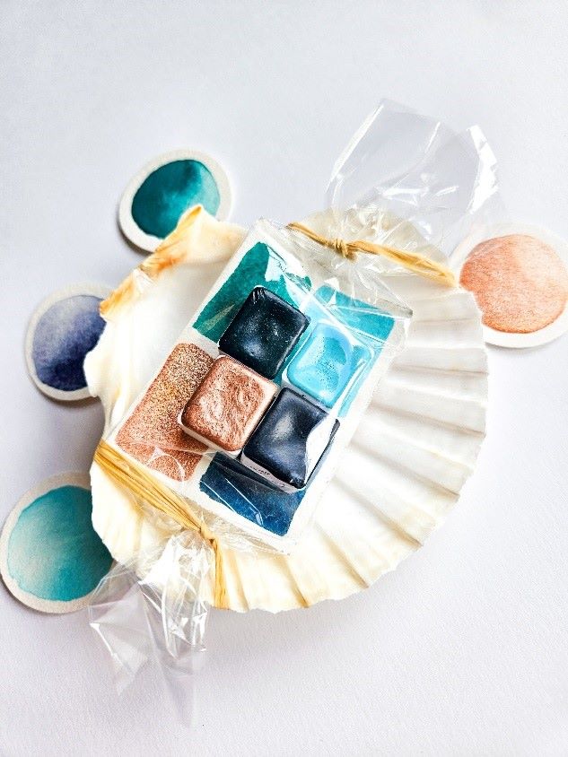 Elle mélange un liant avec des pigments provenant du sud de la France pour tester et concocter ses propres couleurs ! Elle réalise désormais ses godets d’aquarelle elle-même et vous propose des teintes uniques : granuleuses, vives ou pastelles, pour des couleurs 100% naturelles !