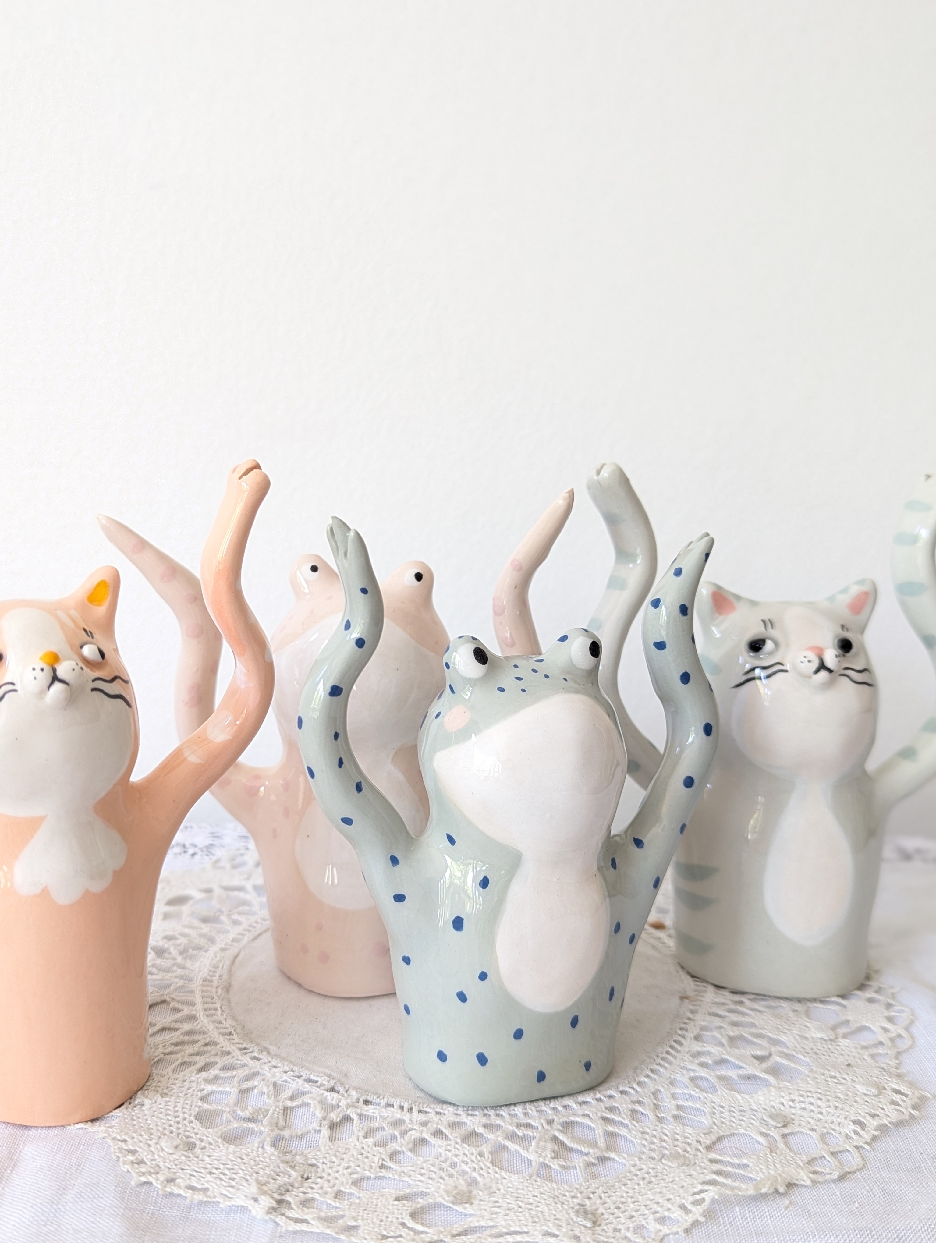 Les sculptures de Florence sont en faïence et sont réalisées entièrement à la main par ses soins, ce qui rend chaque création unique.