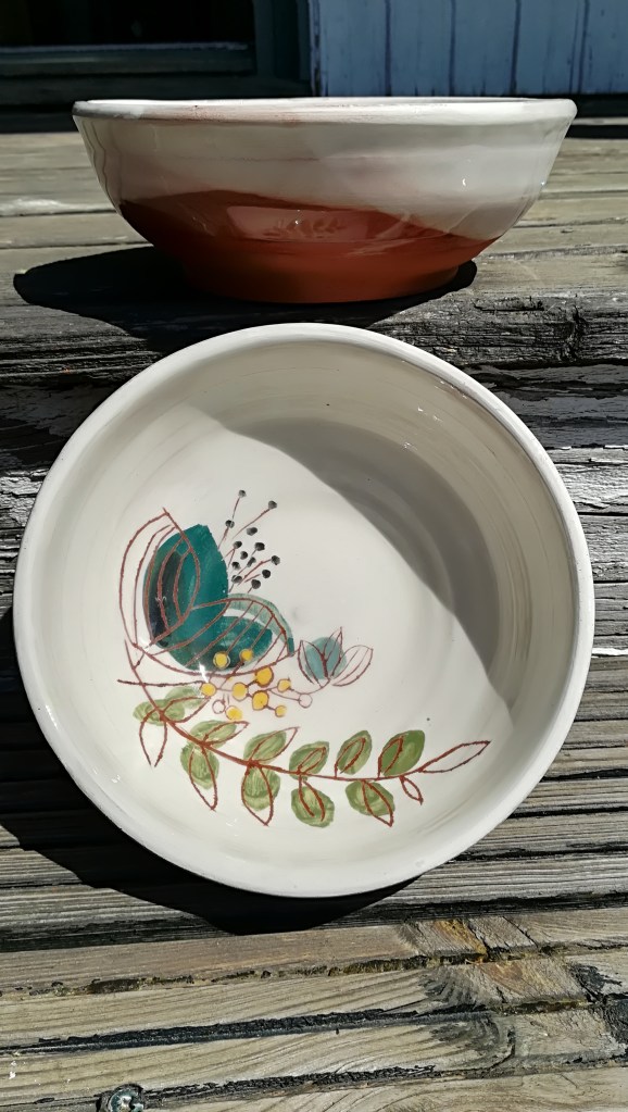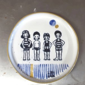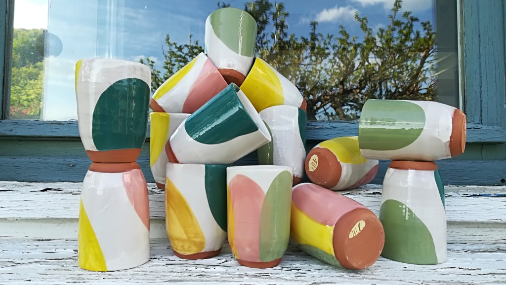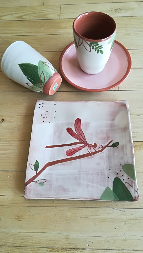 Fascinée par la terre rouge traditionnelle, Marie Lizé crée des pièces utilitaires et décoratives du quotidien (assiettes, gobelets, coupelles, vases, etc) avec la technique de « terre vernissée ». Il s’agit d’une argile rouge qu’elle tourne puis qu’elle recouvre d’un engobe blanc sur lequel elle dessine ses décors à partir d’engobes colorés. Les pièces sont cuites deux fois, à basse température. Elle explore cette technique issue de l’art populaire en alliant des formes simples avec des couleurs acidulées, et ses recherches de décors l’amènent vers des univers doux, peuplés de petites bêtes, oiseaux et végétaux…