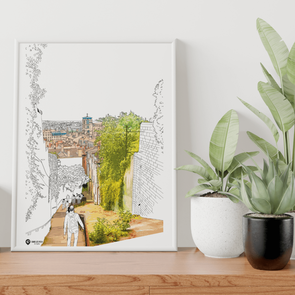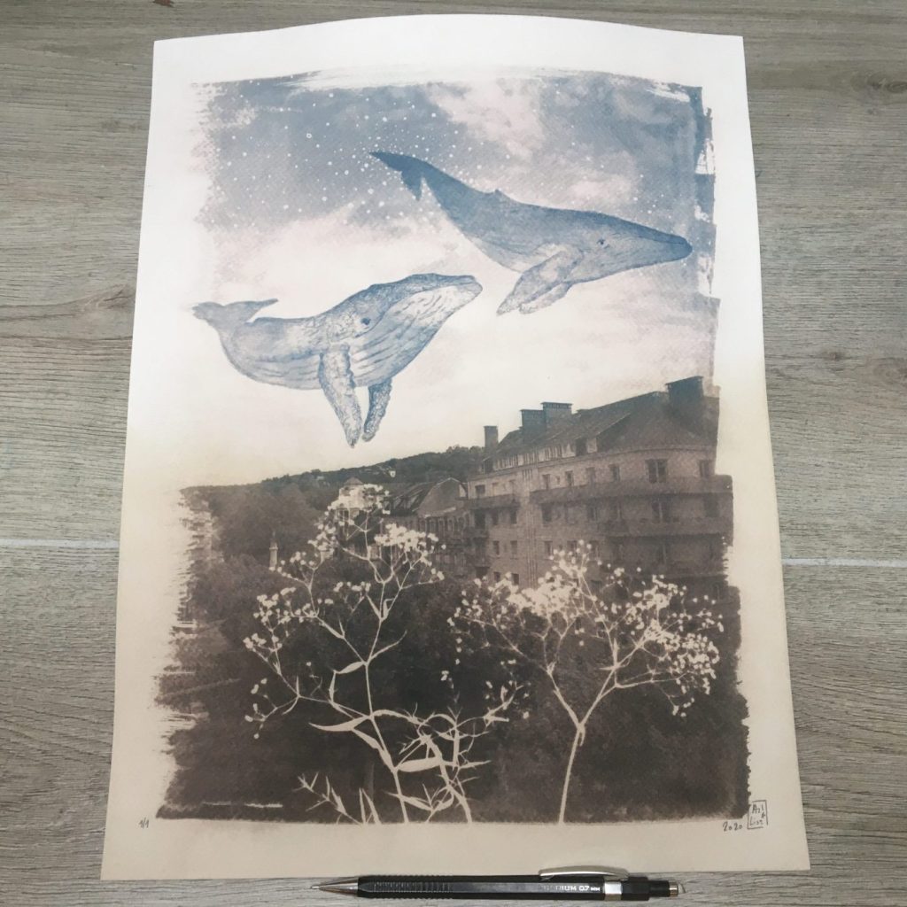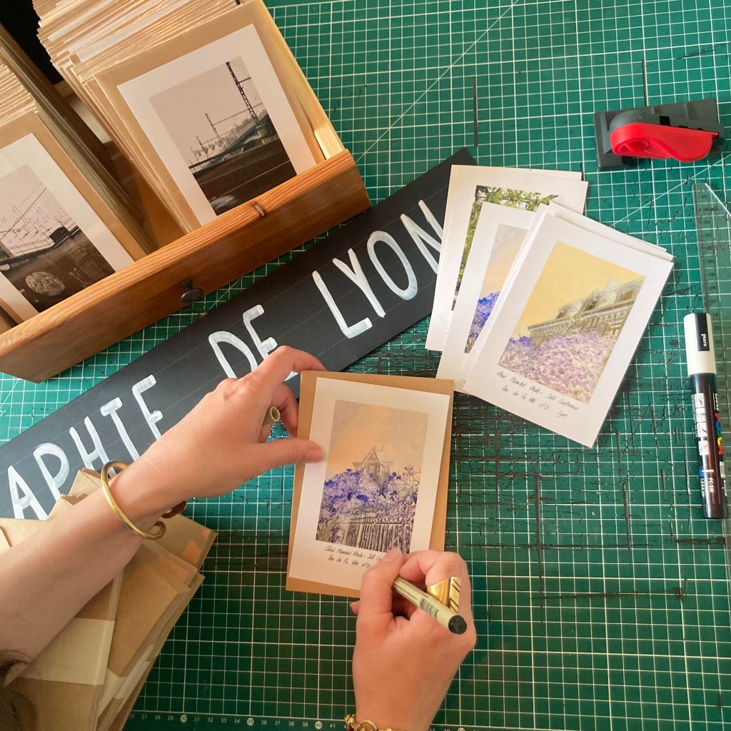 Les impressions des tirages sont sur du papier Fine Art, réalisées dans une imprimerie spécialisée dans les tirages photographiques, sur les pentes de la Croix-Rousse. Elle réalise ensuite les passes-partout biseautés dans son atelier où elle assemble le tout et contrecolle le certificat d’authenticité.