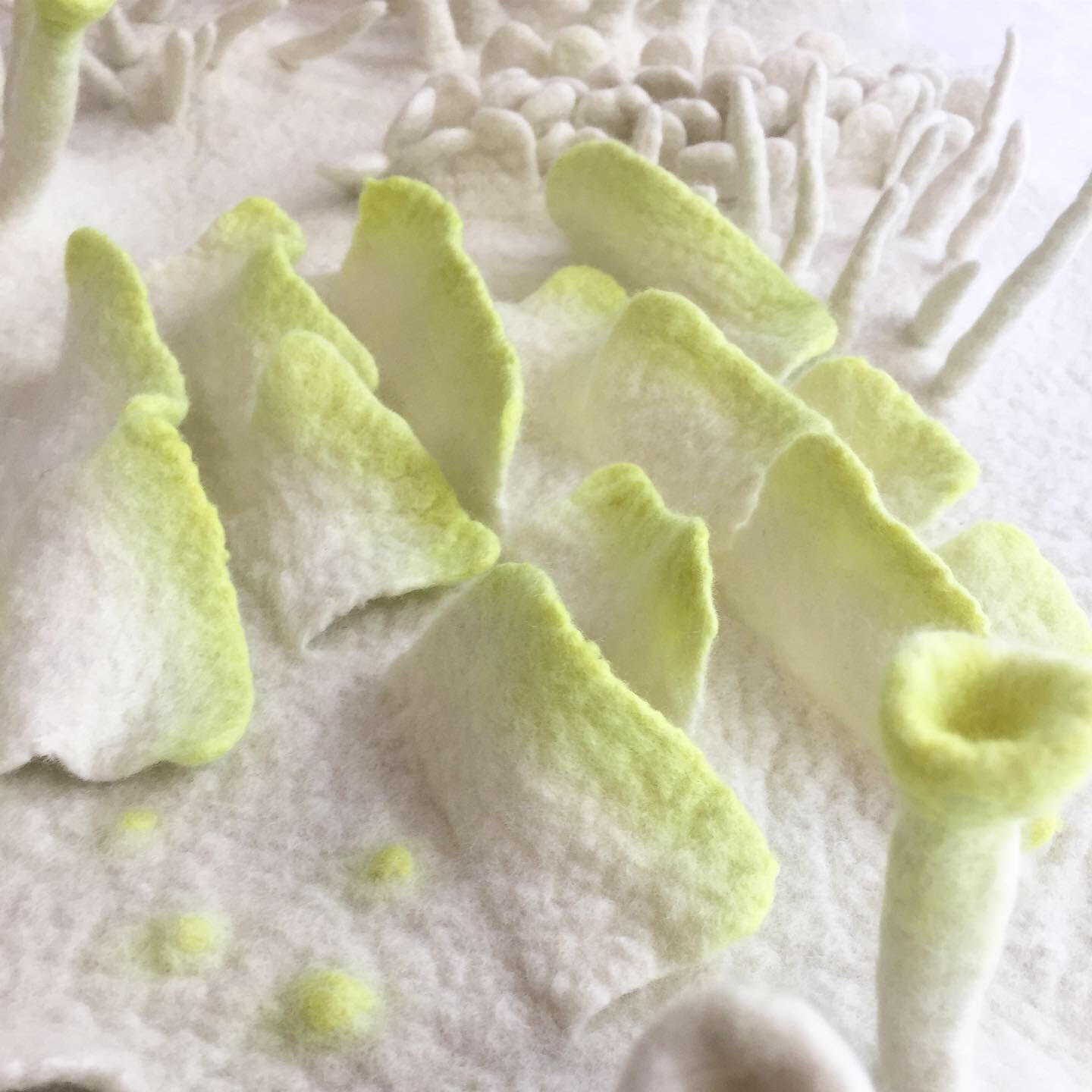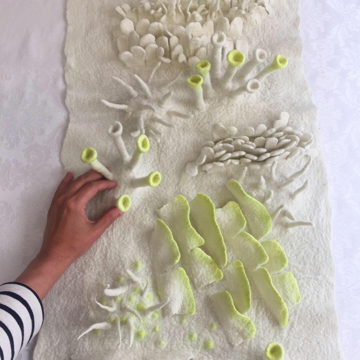 « Je cherche à concevoir des objets qui invitent au rêve, stimulent l’imagination. La nature est une de mes principales sources d’inspiration. Citadine, je m’invente un monde feutré et coloré, peuplé de végétation et d’animaux en tous genres. Mes créations, malgré la diversité des échelles, des sujets et des fonctions, constituent un répertoire illustré, une histoire en trois dimensions. Chaque pièce devient alors le vers d’une poésie tactile que je développe peu à peu. Je m’exprime en sculptant la laine, qui a la capacité de se feutrer sans couture et en une seule pièce. Dans cette narration, je m’amuse à associer des matières naturelles et nobles (laine, soie, coton) à d’autres, plus inattendues (lamés, Lurex, paillettes, fibres de bambou, de lin, de chanvre, ou encore branches de bois, feuilles de thé, lichen…), en portant une attention particulière aux détails graphiques. »