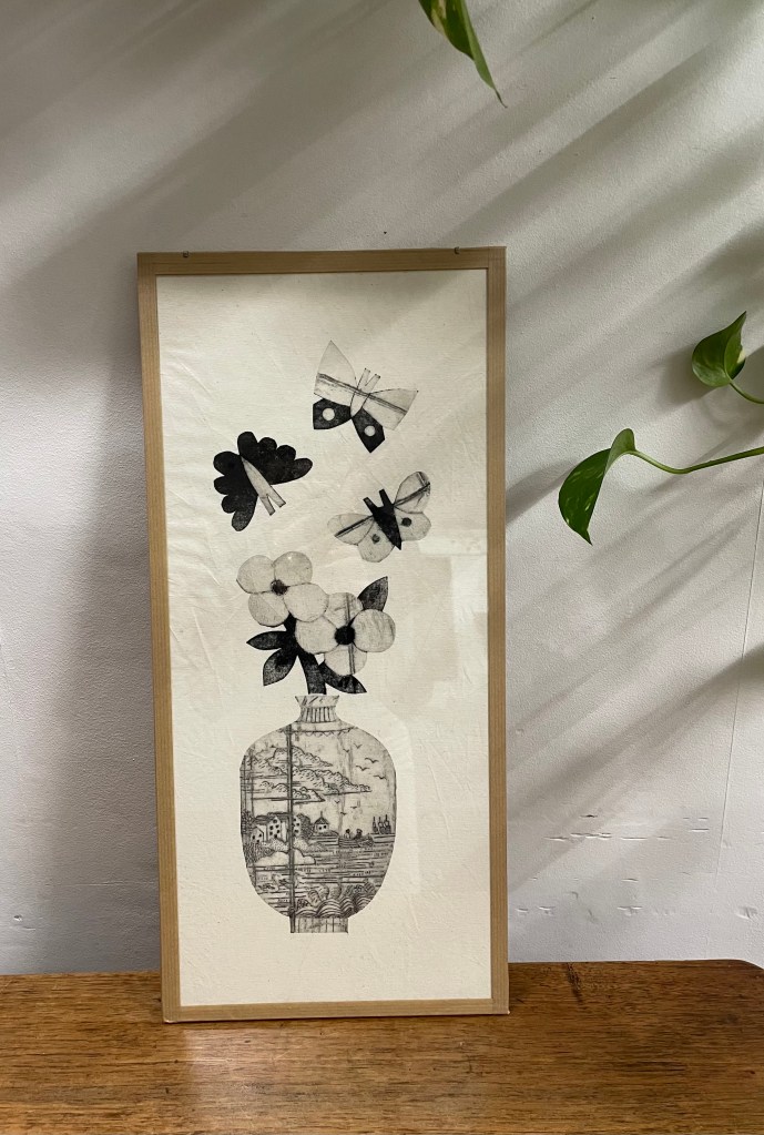 Sa spécialité de départ est la linogravure (lino pour les intimes) : des impressions faites sur papier ou sur tissu, à la main ou à la presse taille-douce. Elle la mêle à d’autres techniques : cyanotype, broderie, gravure à la pointe sèche, monotype… pour un rendu unique et original.